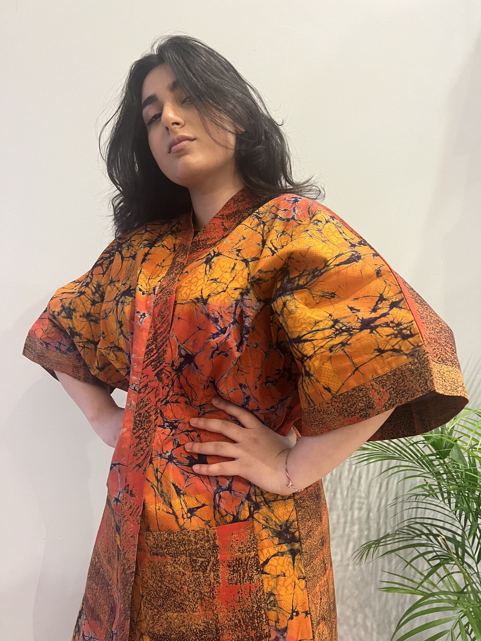 This colorful kimono is designed for those who have a passion for unique clothing. Beautiful in a mix of orange and brown colors. Style it as a dress with heels or sneakers or wear it open over jeans or leather pants. The kimono has handy pockets. A real must-have!