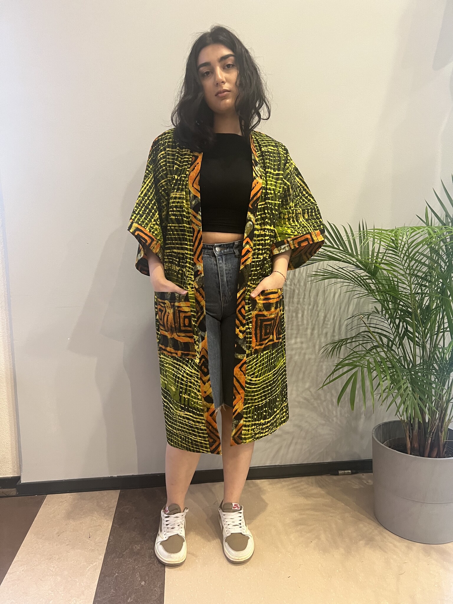 This colorful kimono is designed for those who have a passion for unique clothing. Beautiful in a mix of colors in yellow and orange. Style it as a dress with heels or sneakers or wear it open over jeans or leather pants.