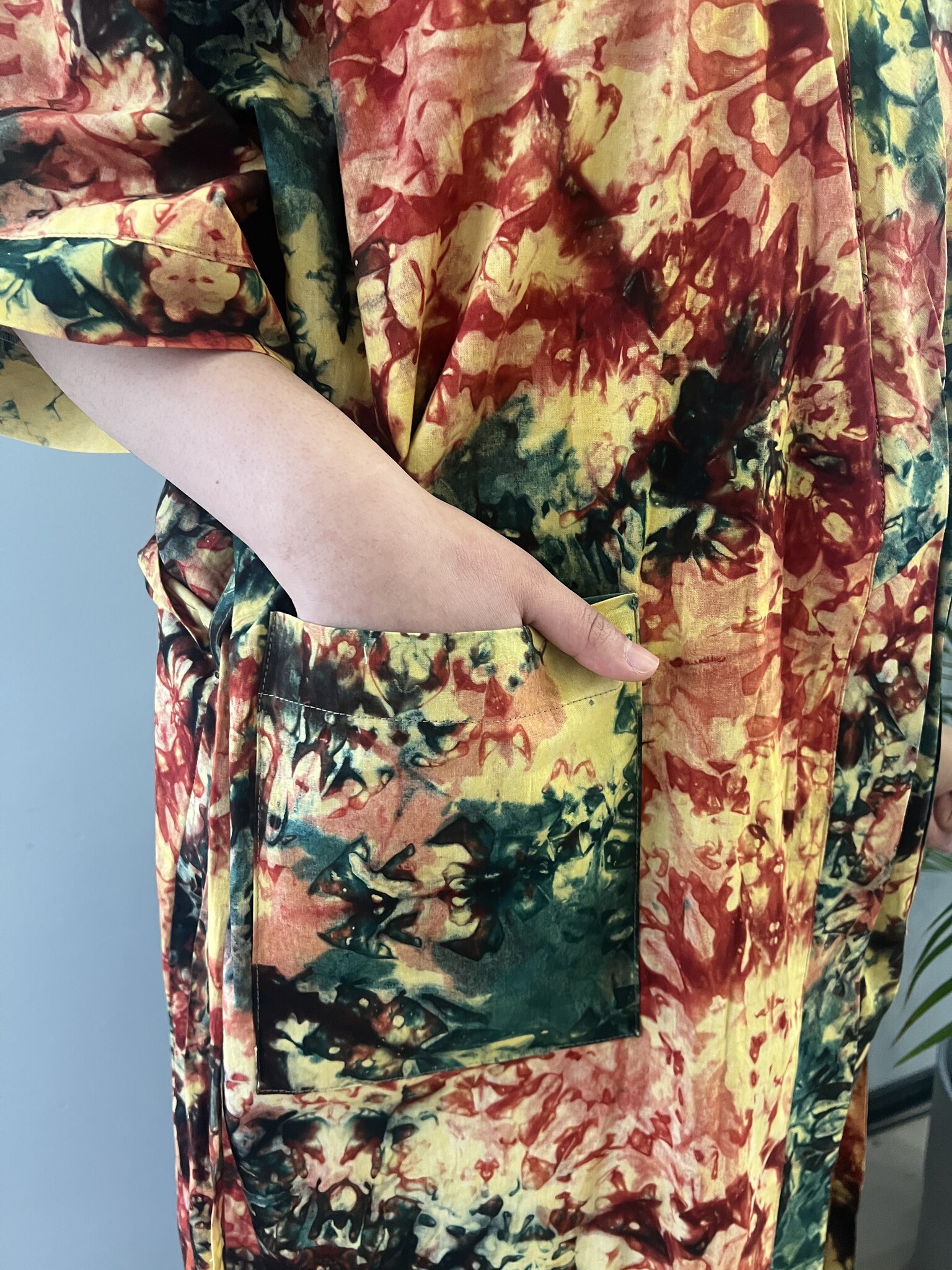 What makes this kimono special is the use of tie dye cotton from Ghana. Tie Dye is a dyeing technique that gives a very special effect to fabrics. This means that each kimono is a unique masterpiece, with its own character and story. At Dinkra we believe in creating something beautiful from colorful fabrics from Ghana. With this kimono you are not only wearing a beautiful piece of clothing, but also a piece of ethical fashion.