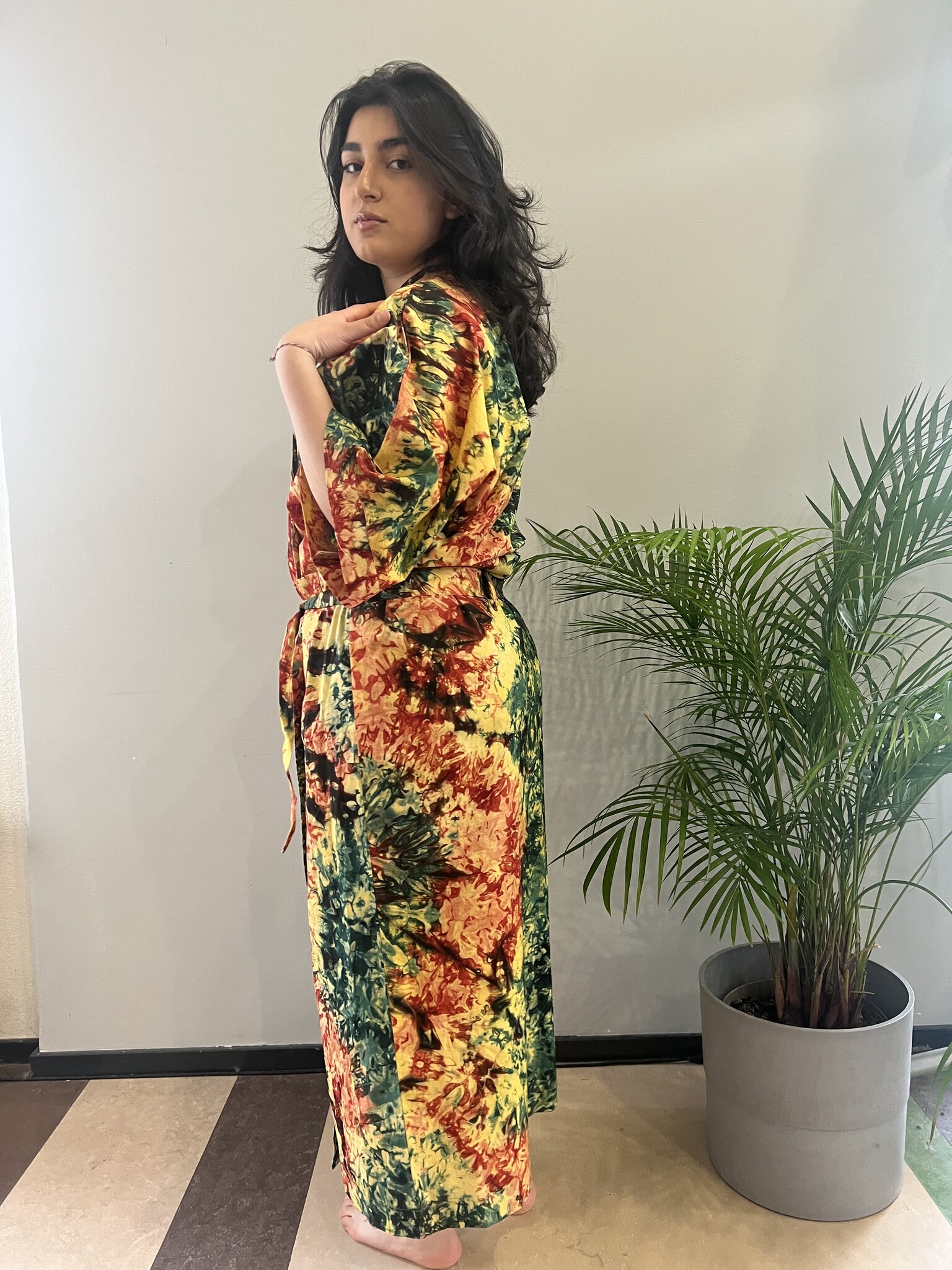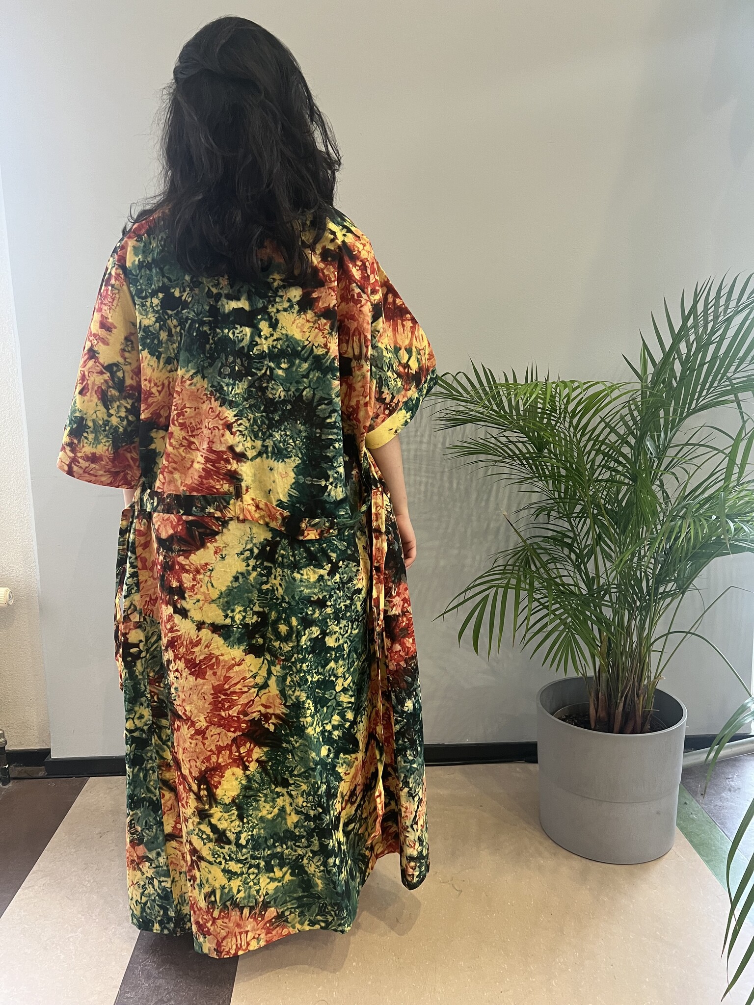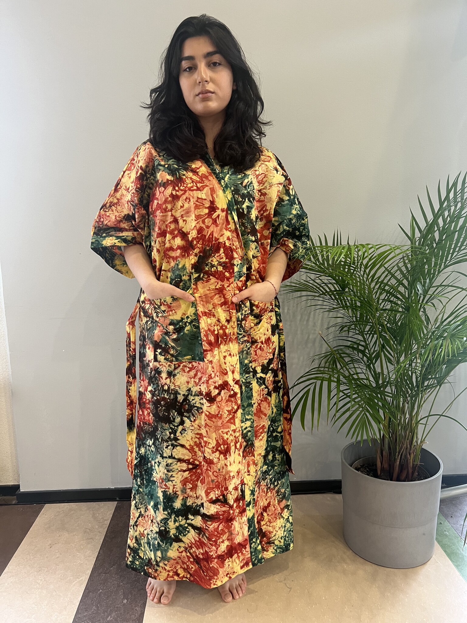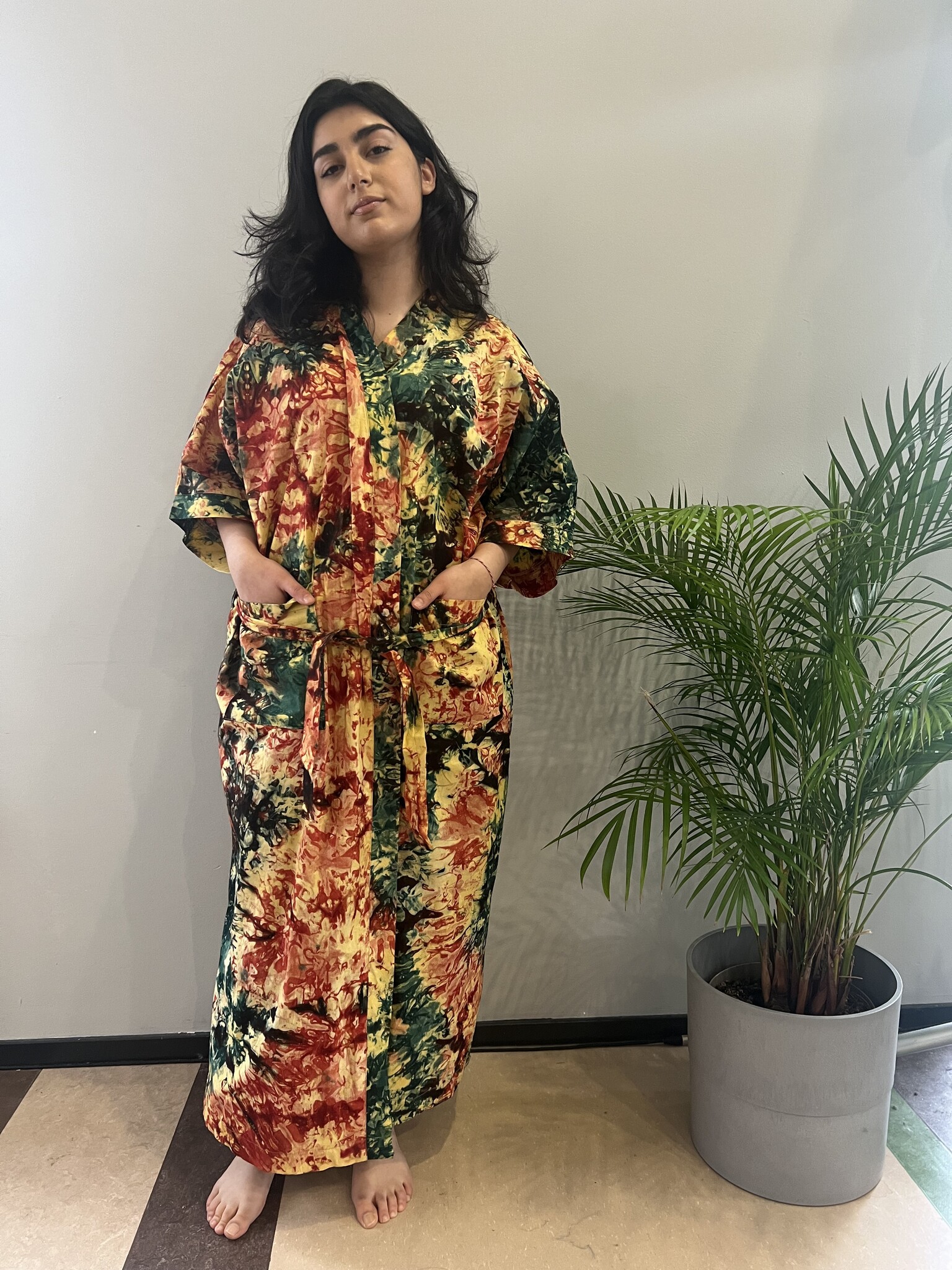 Lange kimono met bloemmotief van zalm groen gele tie-dye katoen