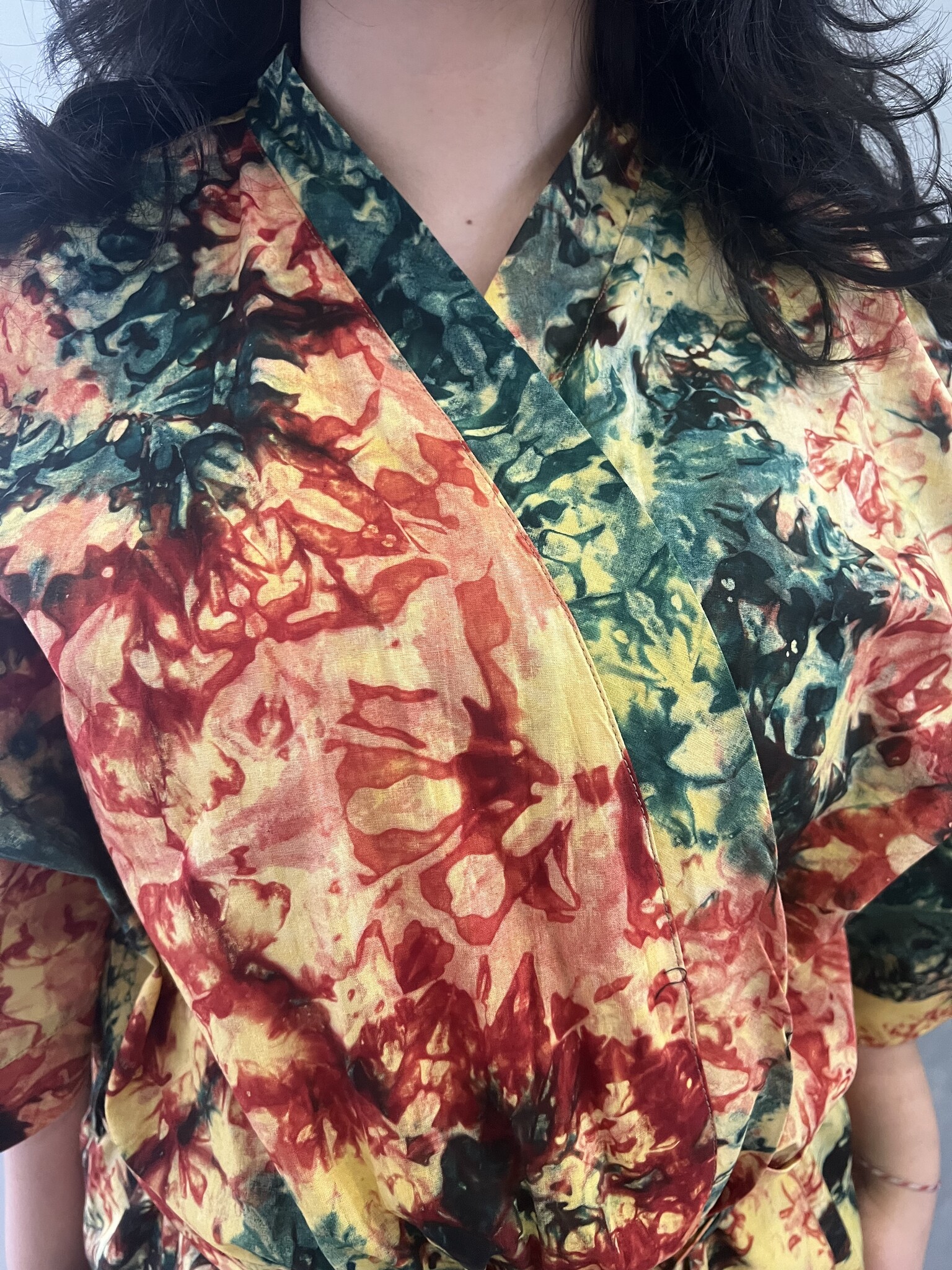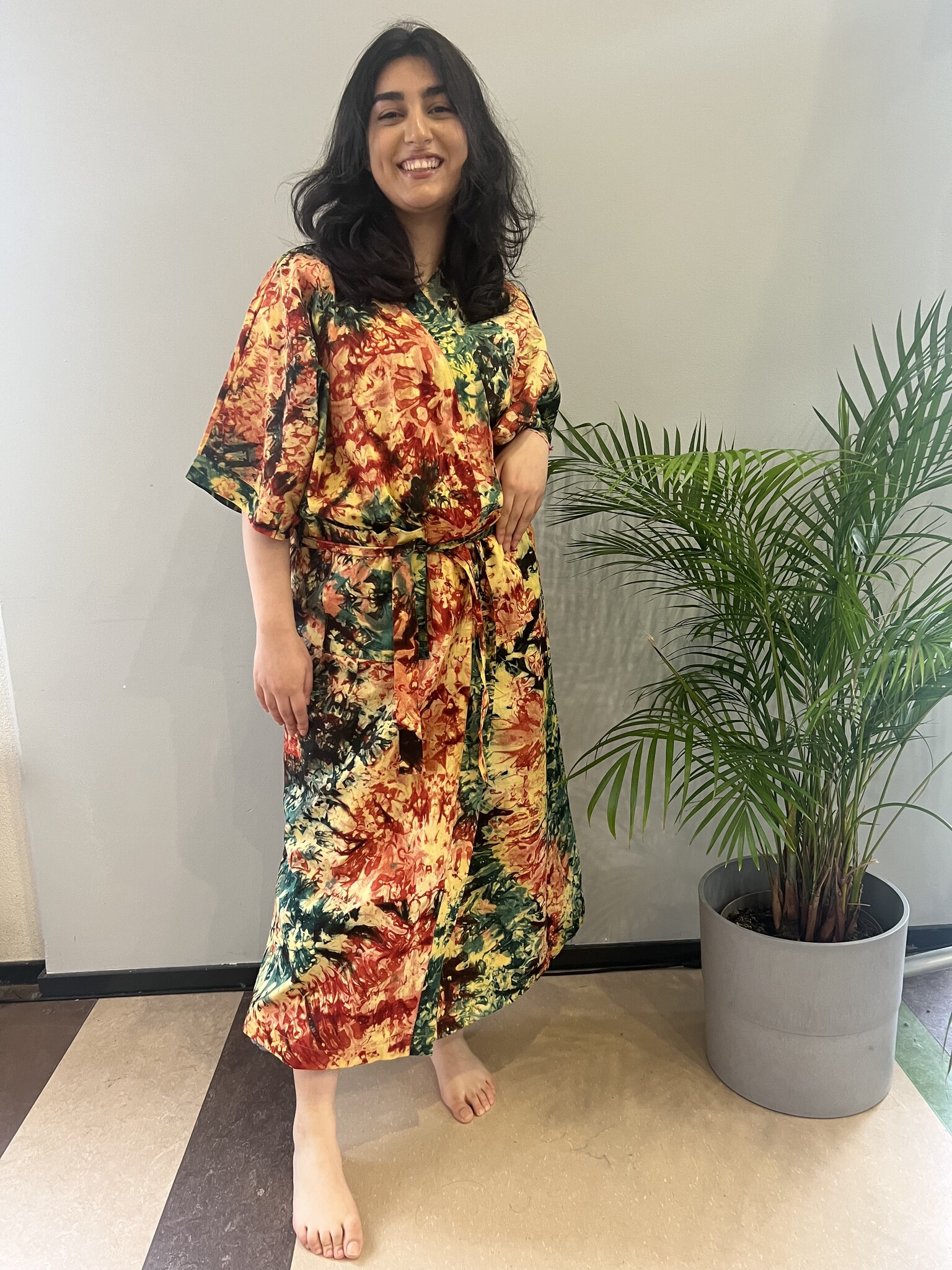 Wat deze kimono bijzonder maakt, is het gebruik van tie dye katoen uit Ghana. Tie Dye is een verftechniek die een heel speciaal effect geeft op stoffen. Dit betekent dat elke kimono een uniek meesterwerk is, met zijn eigen karakter en verhaal. Bij Dinkra geloven we in het creëren van iets moois van kleurrijke stoffen uit Ghana. Met deze kimono draag je niet alleen een prachtig kledingstuk, maar ook een stukje ethische mode.