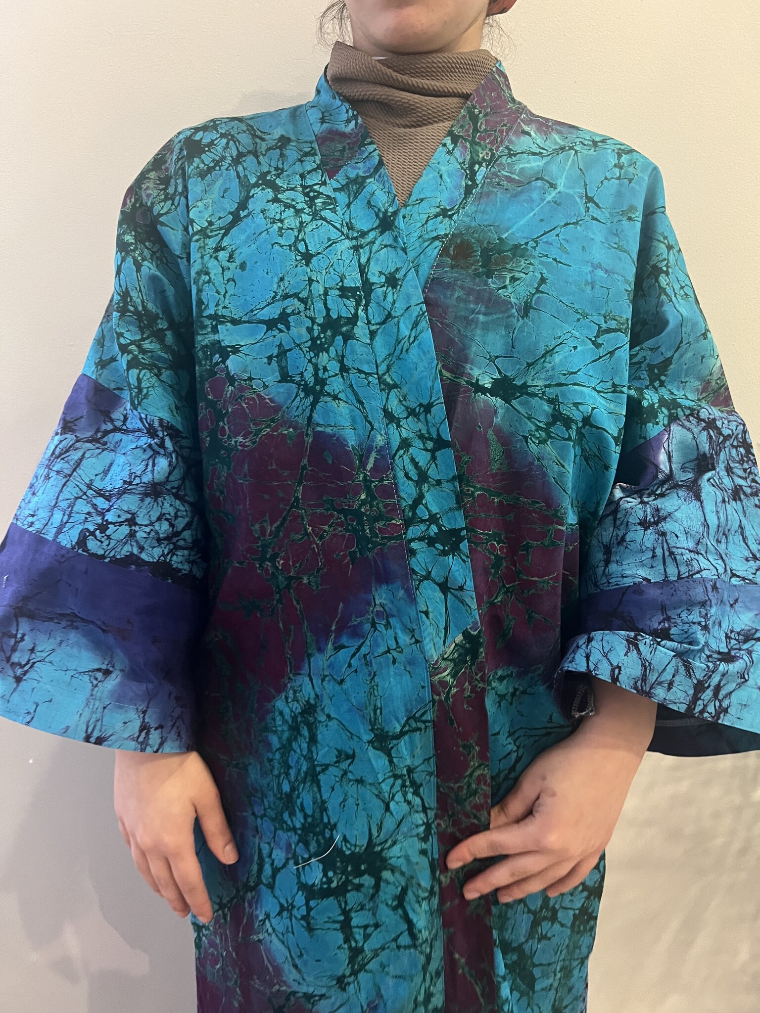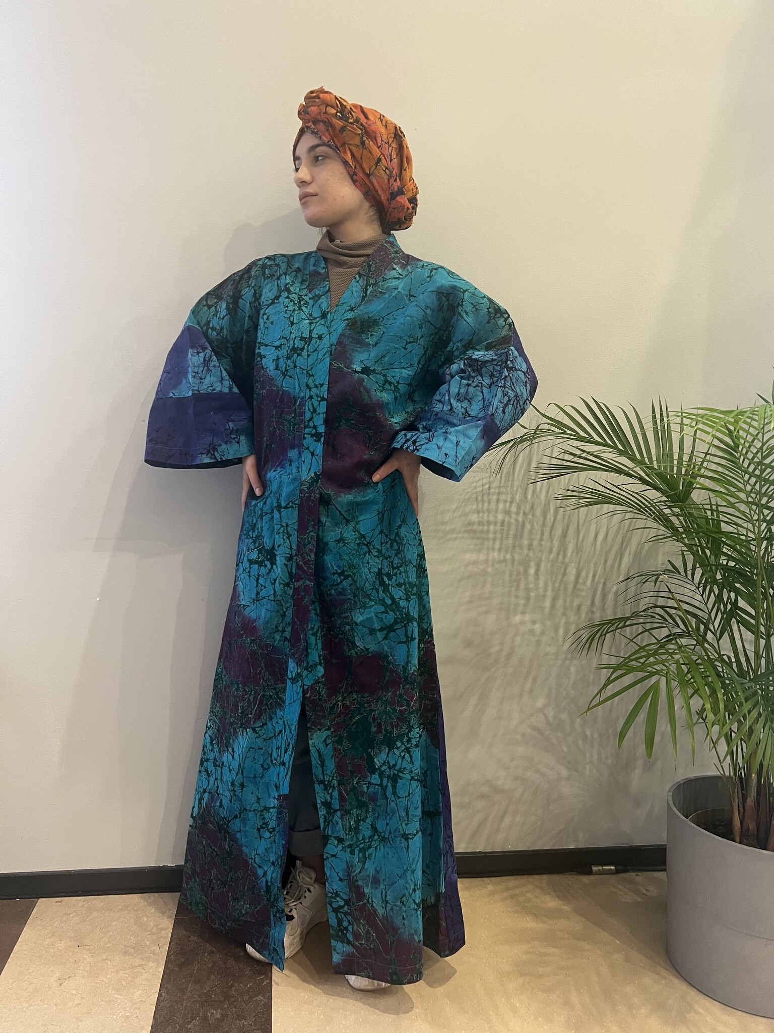 Deze kleurrijke lange kimono is ontworpen voor degenen die een passie hebben voor unieke kleding. Mooi in een mix van blauw, paars en groen. Style hem als jurk met hakken of sneakers of draag hem openhangend over een spijkerbroek of leren broek.