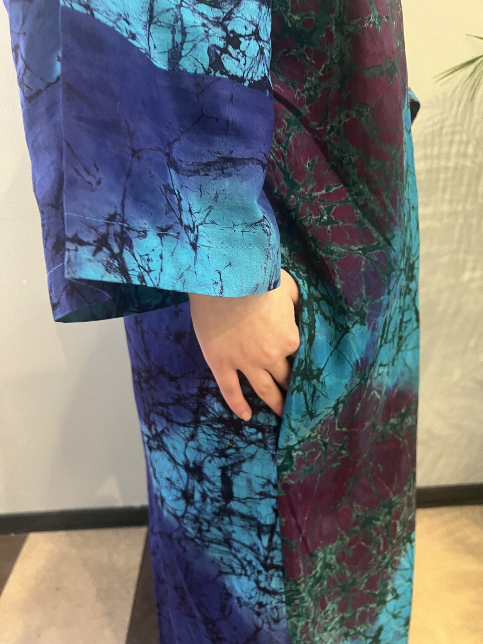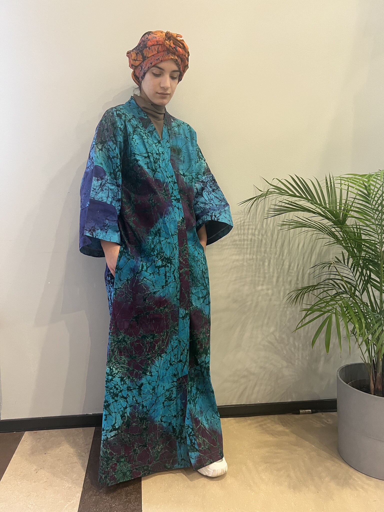 Deze kleurrijke lange kimono is ontworpen voor degenen die een passie hebben voor unieke kleding. Mooi in een mix van blauw, paars en groen. Style hem als jurk met hakken of sneakers of draag hem openhangend over een spijkerbroek of leren broek. De kimono heeft handige steekzakken. Een echte must-have!